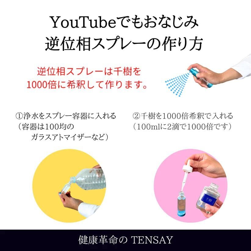 外食の場合もスプレー小瓶に300倍希釈を用意して、サラダやラーメンや料理、お茶・水に2、3回スプレーするだけ。